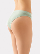 Трусы-бразилиано женские из эластичной сетки. Обработка краев по талии - окантовкой, по ноге - узким кружевом. Хлопковая ластовица. Шов по спинке