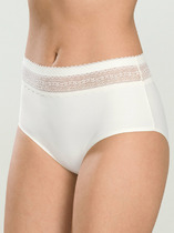 Бразилиано. Комбинированная модель: перед - однотонное хлопковое полотно, спинка и отрезной бочок - кружево. По талии - резинка с фестоном. В центре на детали переда расположен небольшой атласный бант. Декорированы симметричными элементами из кружевной тесьмы,расположенными по линии реза