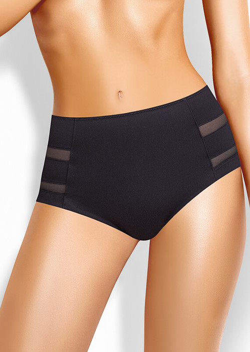 Трусы слипы с завышенной посадкой, сзади и сбоку бесшовная гладкая обработка, спереди декоративные горизонтальные вставки из плотной сетки, перед дублирован сеткой, по талии обработка с зигзагом и узкой резинкой.