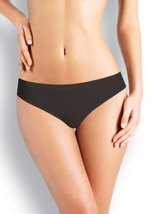 Трусы стринги из однотонного трикотажного полотна, по талии обработаны резинкой "жаккард" ,по ноге -резинкой полуокантовкой