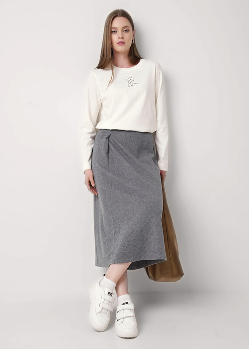 Юбка миди из поливискозного трикотажного полотна джерси. Притачной пояс с внутренней резинкой. Спереди односторонняя складка. Сзади средний шов.