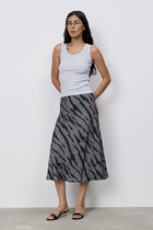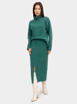 Юбка миди слегка расклешенного силуэта из поливискозного трикотажного полотна джерси. По талии пояс на резинке. По переду и спинке расстроченный средний шов.