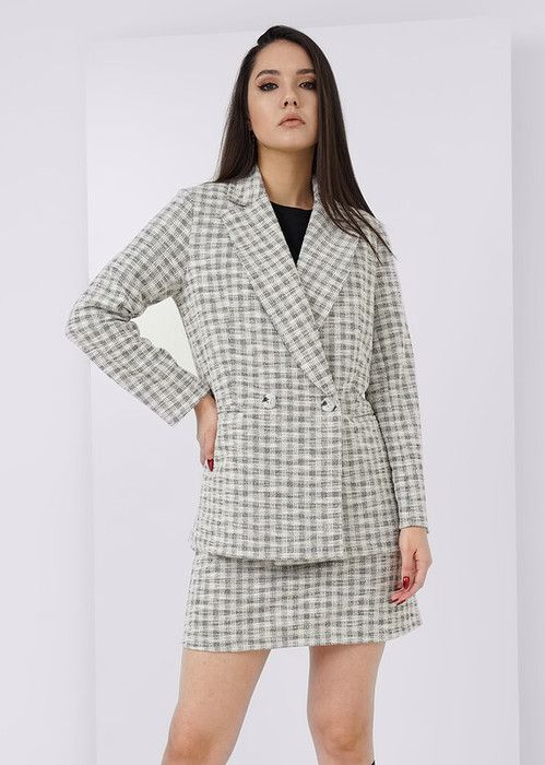 Жакет двубортный из трикотажного полотна джерси, спереди на подкладе. Прямого силуэта, умеренного объёма с втачным рукавом. Воротник с лацканами и застёжкой на петли и 2 пуговицы. Функциональный карман в рамку с клапаном. По спинке средний шов со шлицей.