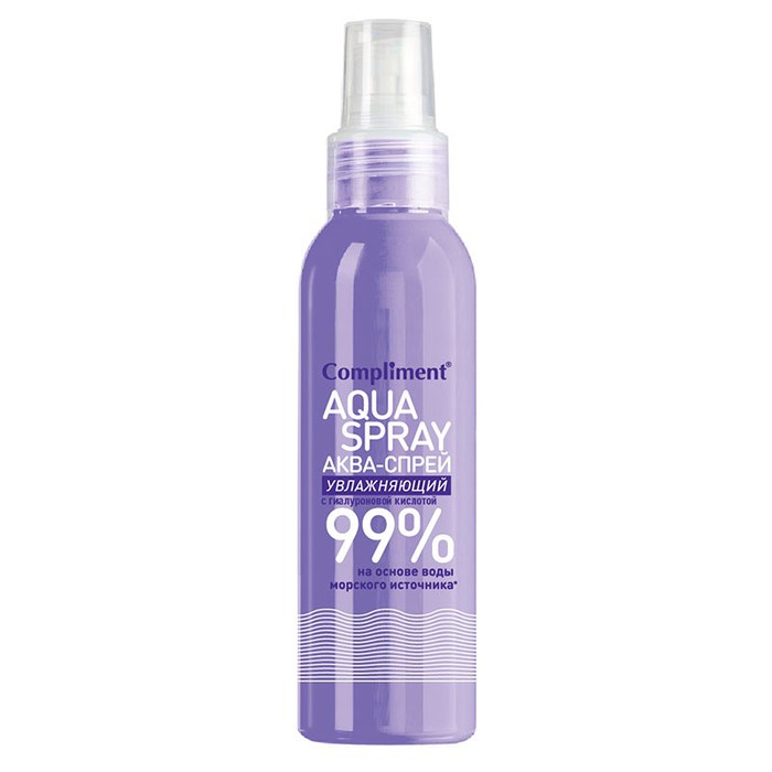 Увлажняющий Аква-спрей Complimentсодержит чистую гиалуроновую кислоту, благодаря которой «утоляет жажду» кожи и удерживает влагу в ее верхних слоях, не давая испаряться. Способствует восстановлению поврежденных тканей. Незаменим для ухода за кожей в жаркое время года. Особенно рекомендуется для зрелой, сухой и обезвоженной кожи.