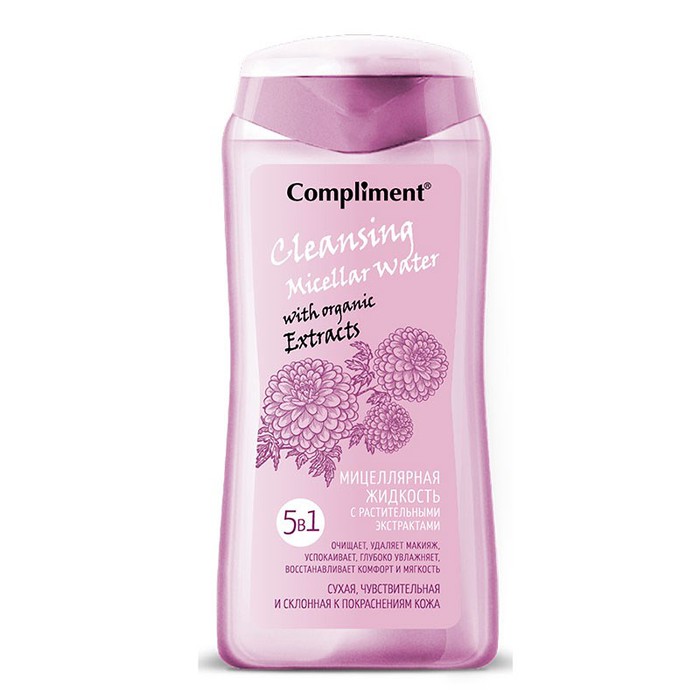 Комплекс растительных экстрактов, входящих в состав мицеллярной жидкости 5 в 1 Compliment оказывает деликатное успокаивающее действие, предотвращает пересушивание кожи после процедуры очищения, восстанавливает увлажненность и комфорт.