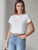 Джемпер женский из однотонного трикотажного полотна с эффектом "фламме" с коротким втачным рукавом. Круглая головина изделия окантована бейкой.
