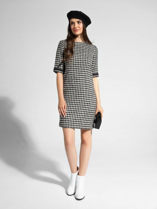 Платье в уточненном французском стиле с легким мерцанием люрекса LPL 1053 – всегда уместная классика как для повседневного офисного гардероба современной девушки, так и для вечернего выхода в свет. Благодаря рисунку «гусиная лапка» и декоративной тесьме по рукавам платье смотрится лаконично, и при этом оригинально. · круглый вырез горловины· прямой силуэт;· длина midi;· рукава 3/4;· плотное фактурное полотно с легким мерцанием люрекса· эксклюзивная тесьма с металлическими элементами, разработанная итальянскими дизайнерами специально для Conte;· сохранение формы и цвета при соблюдении рекомендаций по уходу;· классический французский стиль Коко Шанель;· современная классика для повседневного офисного и вечернего гардероба.
