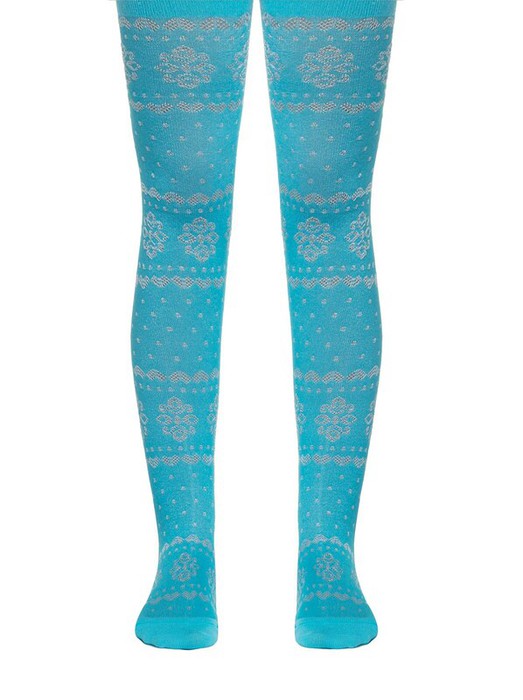 Мягкие эластичные удобные и практичные тонкие детские колготки из хлопка и вискозы, с жаккардовыми рисунками, вывязанными блестящей вискозной нитью. Для девочек.
