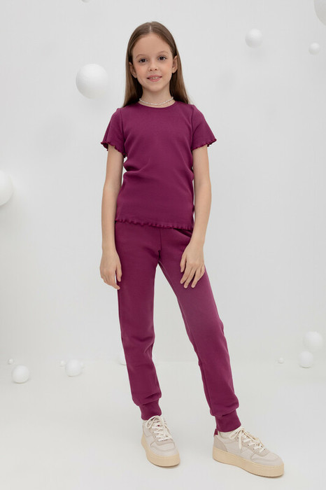 Трикотажные брюки для девочки из футера с начёсом. В составе 80% натурального хлопка и 20% полиэстера, при этом полиэстер ввязан внутрь по особой технологии и не соприкасается с кожей. Эластичный пояс на резинке, по бокам два удобных кармана, внизу эластичные манжеты.