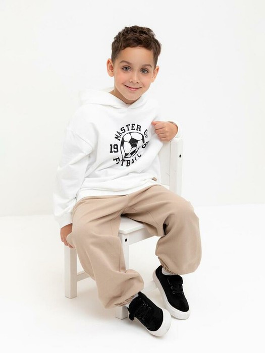 Трикотажные брюки для мальчика из петельчатого футера. Эластичный пояс на резинке регулируется по ширине с помощью шнурка. По бокам два удобных кармана. Внизу эластичные манжеты на резинке.