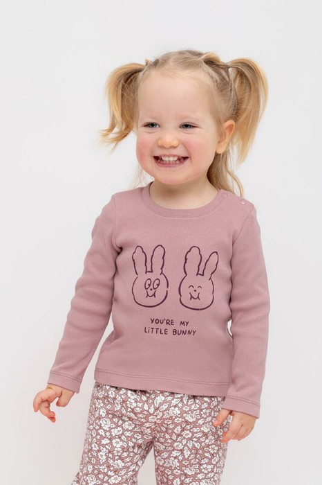 Лонгслив для девочки из высококачественного трикотажного полотна в рубчик. Оригинальный принт выполнен из стойких текстильных красителей.