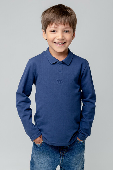 Джемпер поло с длинными рукавами для мальчика из трикотажного  полотна пике. Вязаный воротник. Удобная застежка спереди. По бокам разрезы, обработанные киперной лентой.