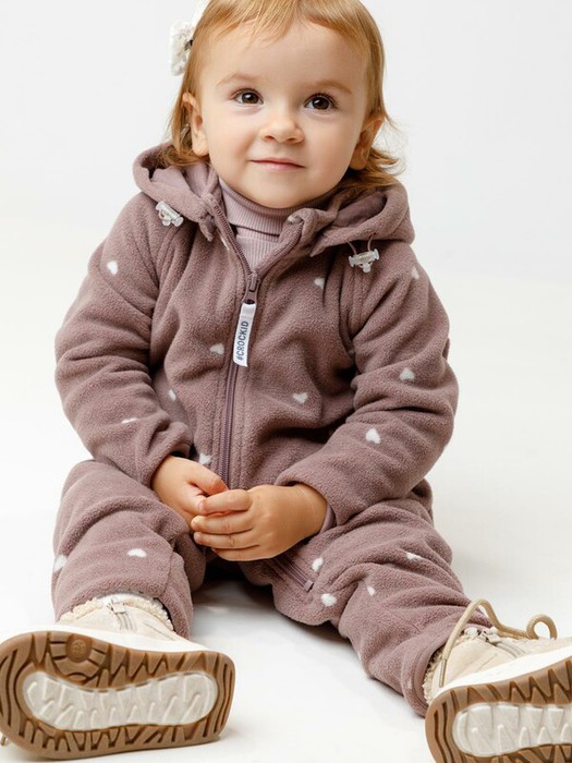 Флисовый комбинезон для девочки со съёмным капюшоном. Капюшон регулируется по ширине с помощью эластичной утяжки со стопперами. Подклад выполнен из гладкого трикотажа супрем, произведённого из высококачественного натурального хлопка. Застёгивается на удлинённую молнию с мягкой защитой шеи и подбородка. В размерах 62, 68 и 74 на рукавах и ножках есть отвороты. Оригинальная набивка выполнена из стойких, гипоаллергенных текстильных красителей. Комбинезон сохраняет цвет и форму после многократных стирок.