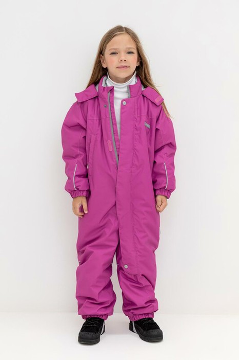 Демисезонный комбинезон для девочки с утеплителем SEE®: 120 г/м2. Выполнен из мембранной ткани с дополнительной тефлоновой обработкой. Данный вид обработки предохраняет изделие от загрязнения и лучше отводит влагу. Подклад из 100% полиэстра. У изделия удлиненная молния для легкого одевания с защитой подбородка. Ветрозащитная планка фиксируется на липучках и кнопках. Несъемный капюшон с эластичной резинкой и застежкой на липучку.По низу рукавов и брючин, а также на спинке изделия предусмотрена эластичная резинка для лучшего прилегания. Функциональный карман с молнией на груди. Для фиксации комбинезона используются съемные силиконовые штрипки. Во всех изделиях верхнего ассортимента для безопасности ребенка предусмотрены светоотражающие элементы.