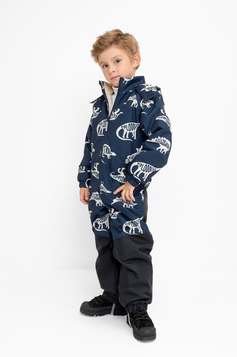 Демисезонный комбинезон для мальчика с утеплителем SEE®: 120 г/м2. Выполнен из мембранной ткани с дополнительной тефлоновой обработкой. Данный вид обработки предохраняет изделие от загрязнения и лучше отводит влагу. Подклад из 100% полиэстра. Удлиненная молния для легкого одевания с защитой подбородка. Ветрозащитная планка фиксируется на липучках и кнопках. Несъемный капюшон с эластичной резинкой и застежкой на липучку. По низу рукавов и брючин, а также на  спинке изделия предусмотрена эластичная резинка для лучшего прилегания. Область коленей дополнительно усилена деталями из основной ткани. Предусмотрены боковые карманы на молнии. Для фиксации комбинезона используются съемные силиконовые штрипки. Во всех изделиях верхнего ассортимента для безопасности ребенка предусмотрены светоотражающие элементы.
