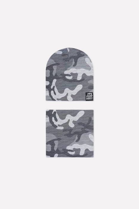 Комплект для мальчика - шапка и снуд из набивного трикотажа рибана с эластаном. Шапка с удлинённой скругленной макушкой, украшена жаккардовой нашивкой. Снуд сплошной.