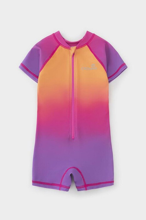 Купальник для девочки. Спереди застёгивается на молнию с мягкой защитой шеи и подбородка. Внутри подклад. Украшен светоотражающим принтом с логотипом. Оригинальная набивка выполнена из стойких гипоаллергенных красителей.
