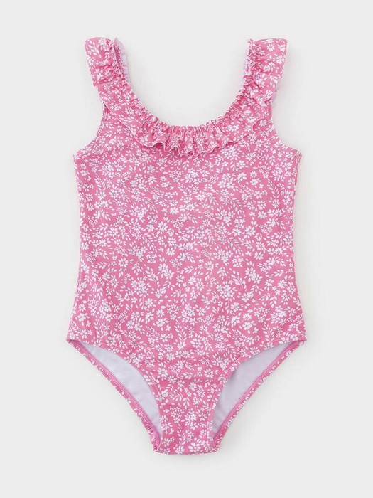 Слитный купальник на лямках для девочки. Украшен оборками. Внутри подклад. Оригинальная набивка выполнена из стойких гипоаллергенных красителей.