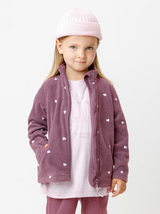 Флисовая куртка для девочки. У изделия высокий воротник и застёжка на молнию с мягкой защитой шеи и подбородка. По бокам два кармана. Оригинальная набивка выполнена из стойких гипоаллергенных текстильных красителей. Куртка сохраняет цвет и форму после многократных стирок.