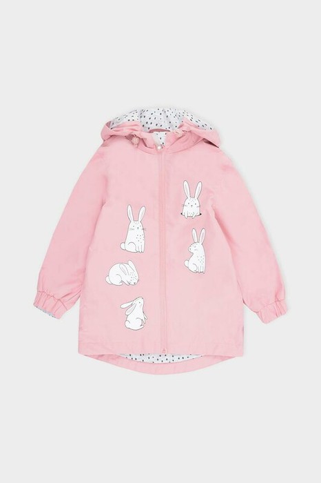 Куртка-ветровка без утеплителя. Верхняя мембранная ткань 1000/1000 с тефлоновым покрытием отталкивает воду и грязь и обладает «дышащими» свойствами. Подкладка - набивной трикотаж из 60% хлопка и 40% полиэстра в размерах 86-98 и однотонный 100% полиэстер - флис в размерах от 98-122. Застёгивается на молнию, предусмотрена защита подбородка. Дополнительная ветрозащитная планка внутри. Удлинённая спинка скруглена. Капюшон не снимается, украшен заячьими ушками, эластичный шнур утягивается и обеспечивает плотное прилегание к голове. На рукаве нашивка. Манжеты на резинке. Боковые карманы без застёжек. Светоотражающие элементы служат для безопасности в тёмное время суток.