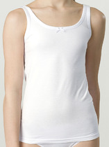 Трикотажные майки в комплекте 2 шт на тонких бретелях из однотонной рибаны, горловина и проймы обработаны кантом, по горловине полочки мережка и атласный бантик. Сохраняют цвет и форму после многократных стирок. Все трикотажные полотна производятся в соответсвии с нормами Швейцарского сертификата ЭкоТекс.