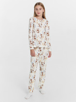 Пижама для девочки из натурального хлопка. Джемпер с длинными втачными рукавами и брюки с эластичной резинкой в поясе. Мягкие манжеты по низу брюк сделаны из материала в рубчик. Оригинальная набивка и принт выполнены из стойких текстильных гипоаллергенных красителей. Изделие сохраняет цвет и форму после многократных стирок. Все трикотажные полотна производятся в соответствии с нормами швейцарского сертификата ЭкоТекс.
