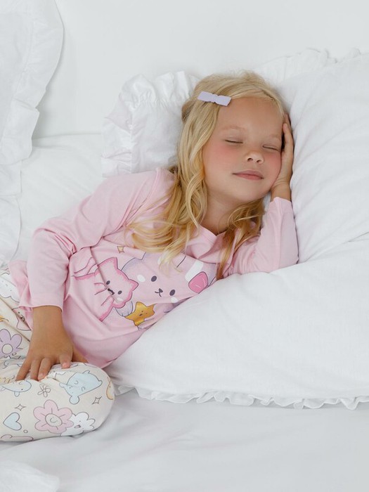 Пижама для девочки из натурального хлопка. Джемпер с длинными втачными рукавами и брюки с эластичной резинкой в поясе. Мягкие манжеты по низу брюк сделаны из материала в рубчик. Оригинальная набивка и принт выполнены из стойких текстильных гипоаллергенных красителей. Изделие сохраняет цвет и форму после многократных стирок. Все трикотажные полотна производятся в соответствии с нормами швейцарского сертификата ЭкоТекс.