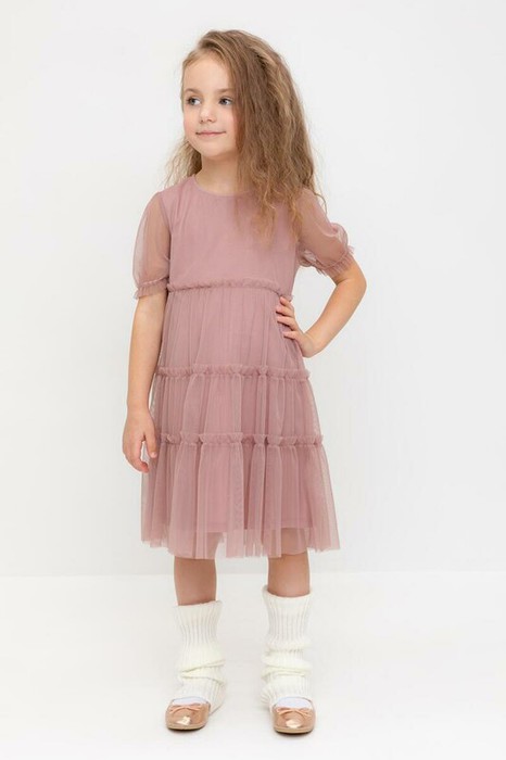 Нарядное платье для девочки из высококачественного трикотажа супрем с лёгким слоем из сетки. Короткие рукава из сетки собраны на резинку. Для удобства одевания платье застёгивается на пуговицу на спинке. Платье сохраняет форму и стойкий цвет после многочисленных стирок и идеально подходит для праздников и фотосессий.