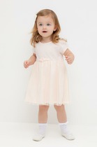 Легкое нарядное платье для девочки из высококачественного трикотажа, верхний слой - из сетки. Застёгивается на спинке с помощью кнопок. Оригинальная набивка выполнена из стойких текстильных гипоаллергенных красителей. Изделие сохраняет цвет и форму после многократных стирок.