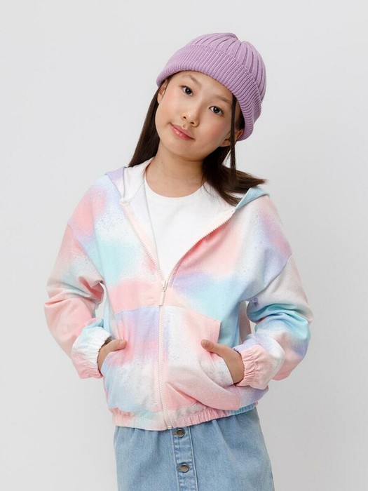 Трикотажная толстовка с капюшоном для девочки из мягкого набивного футера петли. Модель застёгивается на молнию, спереди два кармана. Пояс и манжеты на резинке.