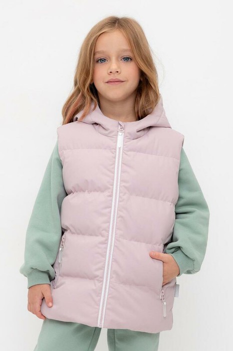 Стеганый жилет с капюшоном для девочки с утеплителем Fellex®: 120 г/м2. Выполнен из мембранной ткани с дополнительной тефлоновой обработкой. Данный вид обработки предохраняет изделие от загрязнения и лучше отводит влагу. Подклад из 100% полиэстра. Капюшон не снимается. Изделие застёгивается на молнию, предусмотрена защита подбородка. Два кармана по бокам застёгиваются на молнии. Во всех изделиях верхнего ассортимента для безопасности ребенка предусмотрены светоотражающие элементы.