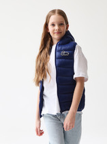 Стеганый жилет с капюшоном для мальчика с утеплителем Fellex®: 120 г/м2. Выполнен из мембранной ткани с дополнительной тефлоновой обработкой. Данный вид обработки предохраняет изделие от загрязнения и лучше отводит влагу. Подклад из 100% полиэстра. Капюшон не снимается. Изделие застёгивается на молнию, предусмотрена защита подбородка. Два кармана по бокам застёгиваются на молнии. Во всех изделиях верхнего ассортимента для безопасности ребенка предусмотрены светоотражающие элементы.