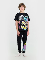 Трикотажный пижамный комплект из натурального хлопка. У футболки короткие рукава со спущенными плечами. Шорты с поясом на резинке. Оригинальная набивка выполнена из стойких, гипоаллергенных текстильных красителей. Все трикотажные полотна производятся в соответствии с нормами Швейцарского сертификата ЭкоТекс.