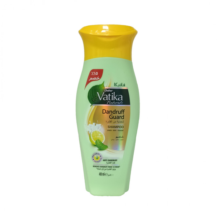 Шампунь Dabur Vatika Dandruff Guard, обогащённый натуральными компонентами, помогает избавиться от перхоти и предотвратить ее появление. Все компоненты, входящие в состав шампуня, дополняют друг друга и в совокупности помогают предотвратить появление или избавиться от перхоти, возвращают волосам их природный блеск, цвет, силу и красоту. Основными компонентами шампуня являются экстракты трав и масла - экстракт лимона, мяты, хны, зеленого миндаля, розмарина, шамбалы, масло чайного дерева и йогурт. Лимон - контролирует активность сальных желез и предотвращает появление перхоти. Йогурт - питает кожу головы и волосы, помогает поддерживать естественный водный баланс кожи и волос. Мята - охлаждает и успокаивает кожу головы, придаёт ощущение чистоты и свежести. Масло чайного дерева - оказывает успокаивающее, противогрибковое, заживляющее, дезинфицирующее действие. Способ применения : Нанесите шампунь на влажные волосы, помассируйте круговыми движениями несколько минут и смойте водой. При необходимости повторите. Для прекрасного комплексного ухода, идеально завершить мытьё волос подходящим Вам кондиционером для волос. Наилучший результат достигается при регулярном использовании шампуня.