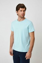 Фуфайка мужская из однотонного трикотажного полотна с коротким рукавом. Горловина круглая обработана обтачкой. Низ рукава обработан манжетами. Обтачка и манжеты изделия из контрастного отделочного полотна.