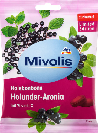Конфеты для горла с ягодами бузины и черноплодной рябины Mivolis не содержат сахара и содержат витамин С. Особая вкусовая композиция фруктовой, сладкой черноплодной рябины со слегка терпкой ноткой бузины дополнена пикантным ментолом и обеспечивает освежающее удовольствие для горла и горла. Всего 2 конфеты в день способствуют нормальной работе иммунной системы благодаря содержанию витамина С.