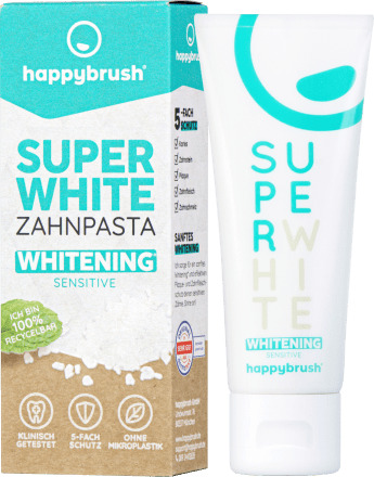Зубная паста SuperWhite & Protect от HappyBrush благодаря своей мощной двойной формуле обеспечивает бережное отбеливание и эффективную 5-кратную защиту зубов и десен. Его мятный вкус также придает свежее дыхание. Тюбик также на 100 % пригоден для вторичной переработки и на 60 % изготовлен из переработанного материала. Формула зубной пасты не содержит диоксида титана.