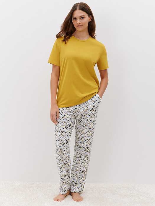 "Женский домашний комплект: свободная футболка с коротким рукавом и круглым вырезом, и прямые брюки с карманами и поясом на резинке.