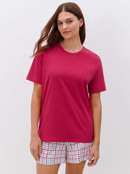 "Женская пижама: прямая футболка с круглым вырезом и коротким рукавом и свободные шорты с карманами и поясом на резинке.