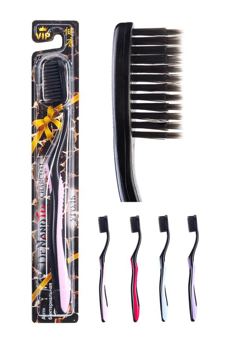 Первый ряд закругленных щетинок великолепно полирует эмаль, а второй ряд, тонких и удлиненных щетинок, отлично очищает все труднодоступные места, межзубные промежутки и участки между зубами и десной. Активированный уголь корейского бамбука имеет высокую пористость, обладает сильным дезодорирующим эффектом, поглощает вредные вещества, предотвращает неприятные запахи и убивает 99.9% кишечной палочки (Escherichia coli). Мельчайшие частицы угля, размером в 100ppm, высокоэффективное и абсолютно безопасное средство для гигиены полости рта. Щетинки сделаны из высокостойкого к износу полиэтилентерефталата (PBT), который не впитывает в себя пасту и воду. Средняя жесткость. Элегантная, эргономичная и антискользящая ручка, состоящая из полипропилена (PP) и резины.