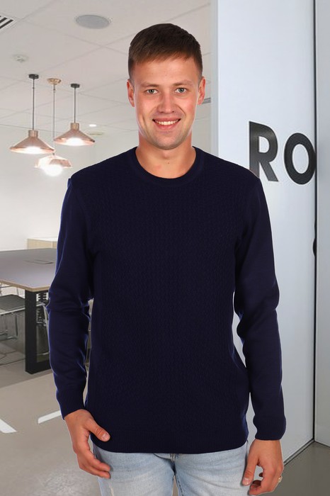 Мужской свитер прямого силуэта с округлой горловиной. По горловине, низу изделия и рукавов - резинка. Передняя полочка из фактурного трикотажа, рукава и спинка гладкие