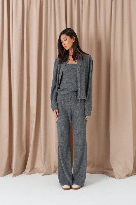 Джемпер прямого кроя, выполнен из трикотажного ворсистого полотна серого цвета. Характеристика: прямой крой, воротник стойка, застежка центральная планка на петли-пуговицы, по низу платная чуть заужена, рукав втачной, манжет широкий. Длина рукава от края горловины 78см, длина изделия по спинке 51см.
