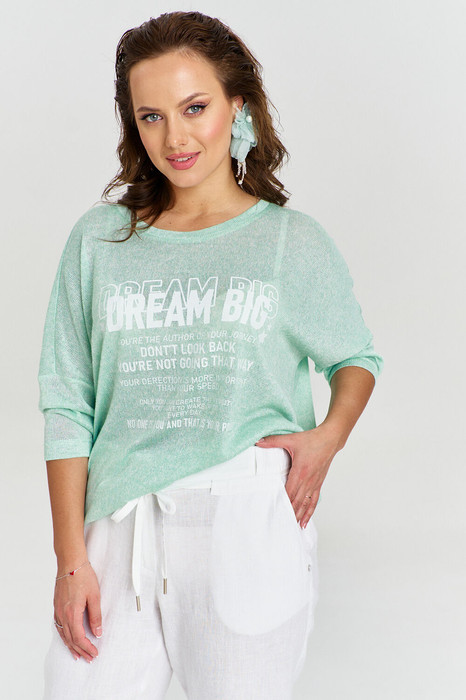 Джемпер из тонкого вискозного трикотажа, свободного силуэта, "оверсайз", с круглой горловиной с отрезной бейкой.  Линия плеча спущена. Рукав 3/4, зауженный. На переде авторский принт.