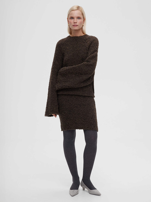 Джемпер хорошо работает как самостоятельная модель и легко собирается в комплект с брюками или юбками букле из альпаки и шерсти Aim Clo. Силуэт остаётся спокойным, позволяя фактуре быть главным акцентом образа.