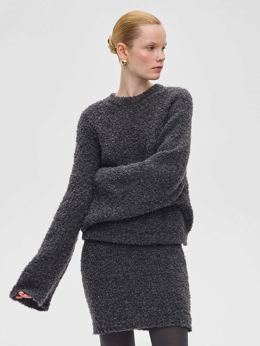Джемпер хорошо работает как самостоятельная модель и легко собирается в комплект с брюками или юбками букле из альпаки и шерсти Aim Clo. Силуэт остаётся спокойным, позволяя фактуре быть главным акцентом образа.