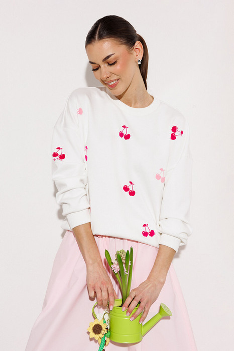 Джемпер из технологичного трикотажного полотна с эффектом peach. Прямого силуэта с втачным рукавом и спущенной линией плеча, с манжетой из отделочной ткани по низу рукава. По переду и на рукаве печать "CHERRY". По горловине и низу изделия притачная планка из отделочной ткани.