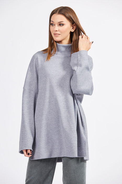 Джемпер выполнен из однотонного трикотажного полотна. Джемпер прямого силуэта, длиной ниже линии бедер. Перед и спинка цельные. Воротник-стойка. Плечевой шов спущен. В боковых швах разрезы.(Внимание: полотно с небольшим ворсом, следовательно, подвержено образованию катышков.)