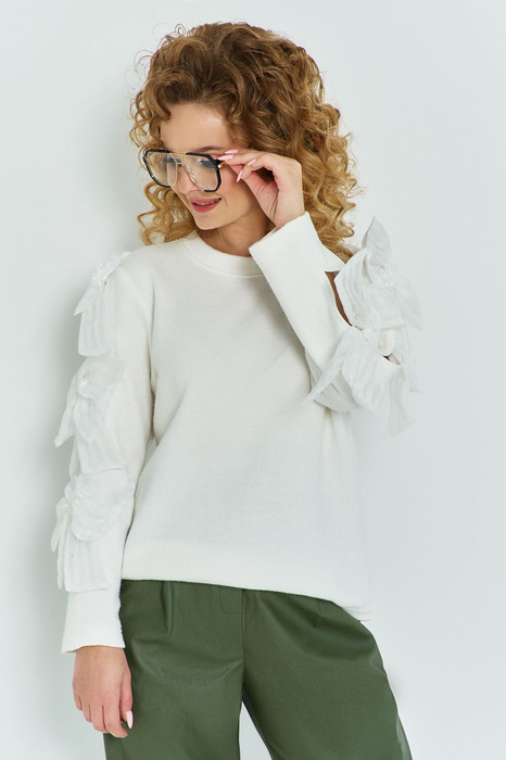 Джемпер женский свободного кроя , выполнен из мягкого трикотажа "ЕвроАнгора". Горловина округлая, рукав втачной, длинный. По длине рукава выполнен разрез с декоративными настрочными элементами "Бант"