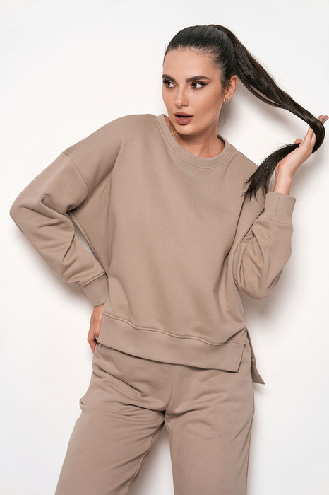 Женский худи свободного силуэта выполнен из высококачественного футера 3-х нитки класса "пенье". Лицевая сторона ткани гладная, изнанка - петлеобразная. Худи свободного силуэта со спущенной линией плеча, перед немного короче спинки, по бокам декоративные разрезы. Горловина, низ худи и рукавов выполнены из трикотажного полотна в рубчик (резинка) "кашкорсе" в тон основной ткани.