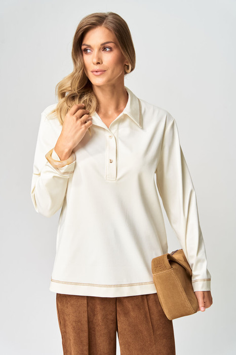 Джемпер прямого силуэта с воротником поло из плотной хлопковой ткани "двухнитка". Рукав втачной одношовный. По низу изделия, по низу рукава и по воротнику проложена отделочная строчка. Длина джемпера- 66 см, длина рукава - 60 см. Данная модель прекрасно сочетается с другими моделями из нашей коллекции 35204, 15408/1, 15408, 35377. Создайте гармоничный образ, комбинируя эти изделия!